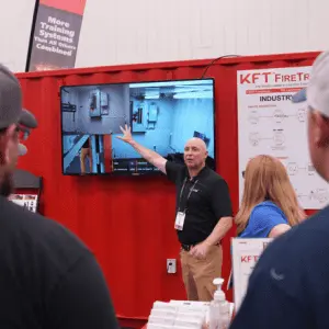 In collaboration with KFT Fire Trainer, FLAIM Systems demonstrated a world first in hyper reality learning, combining augmented reality in a containerized live fire simulation to deliver a synthetic CO2 extinguisher training event.