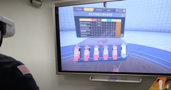 The virtual environment includes a space to educate trainees on what types of fires/materials you should use each different extinguisher type for.