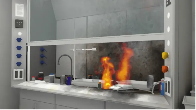 Our VR training addresses the unique fire risks in science lab classrooms and similar spaces, with scenarios like solvent fires in lab fume hoods and magnesium fires in CNC milling machines. Participants will learn to use different extinguishers, assess risks, and implement safety procedures, including shutting off power or gas supplies.