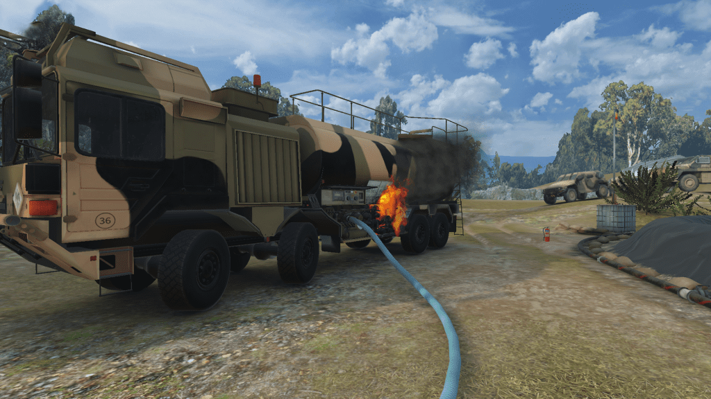 In our newest Army Bulk Fuel Tanker Fire training environment at a remote fuel depot, trainees must isolate the fuel delivery manifold on an army truck before proceeding to extinguish the fire. To make matters more complex, the trainees must also combat the wind, which can make the line of approach to the fire difficult. How trainees decide to attack the fire is vital to their success.