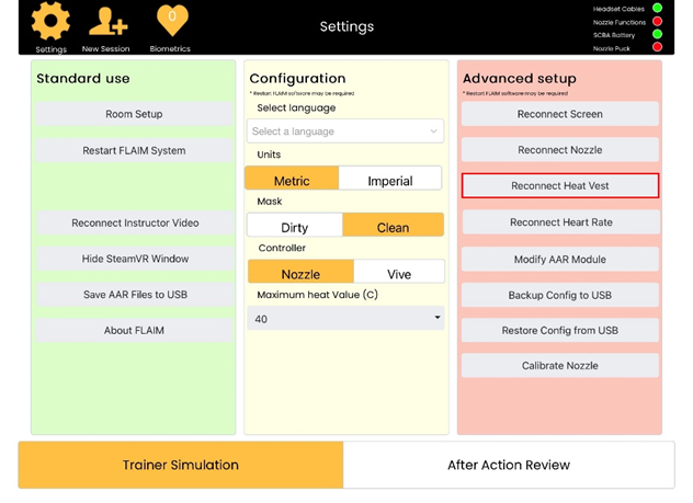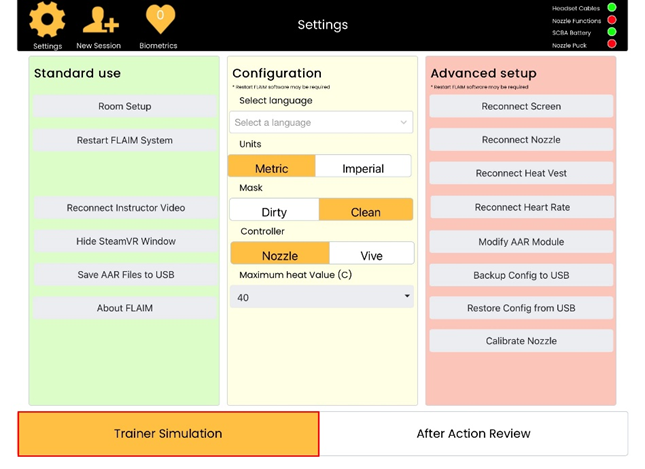 6. Select the Restart FLAIM System button under 'Standard Use' on the left hand side. This confirms all updates to the system. Then press the Trainer Simulation box in the bottom left hand corner.