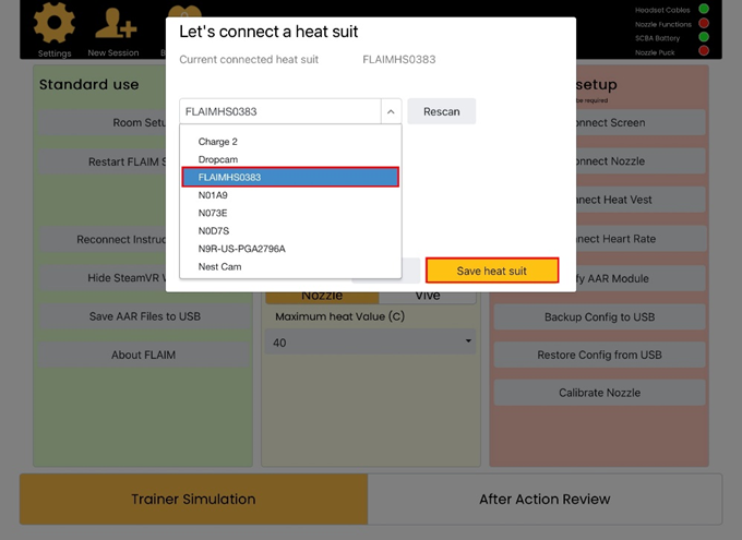 3. Use the drop-down menu to locate your Heat Vest. To find the ID of the Heat Suit, check the back of the battery pack in the front pouch.