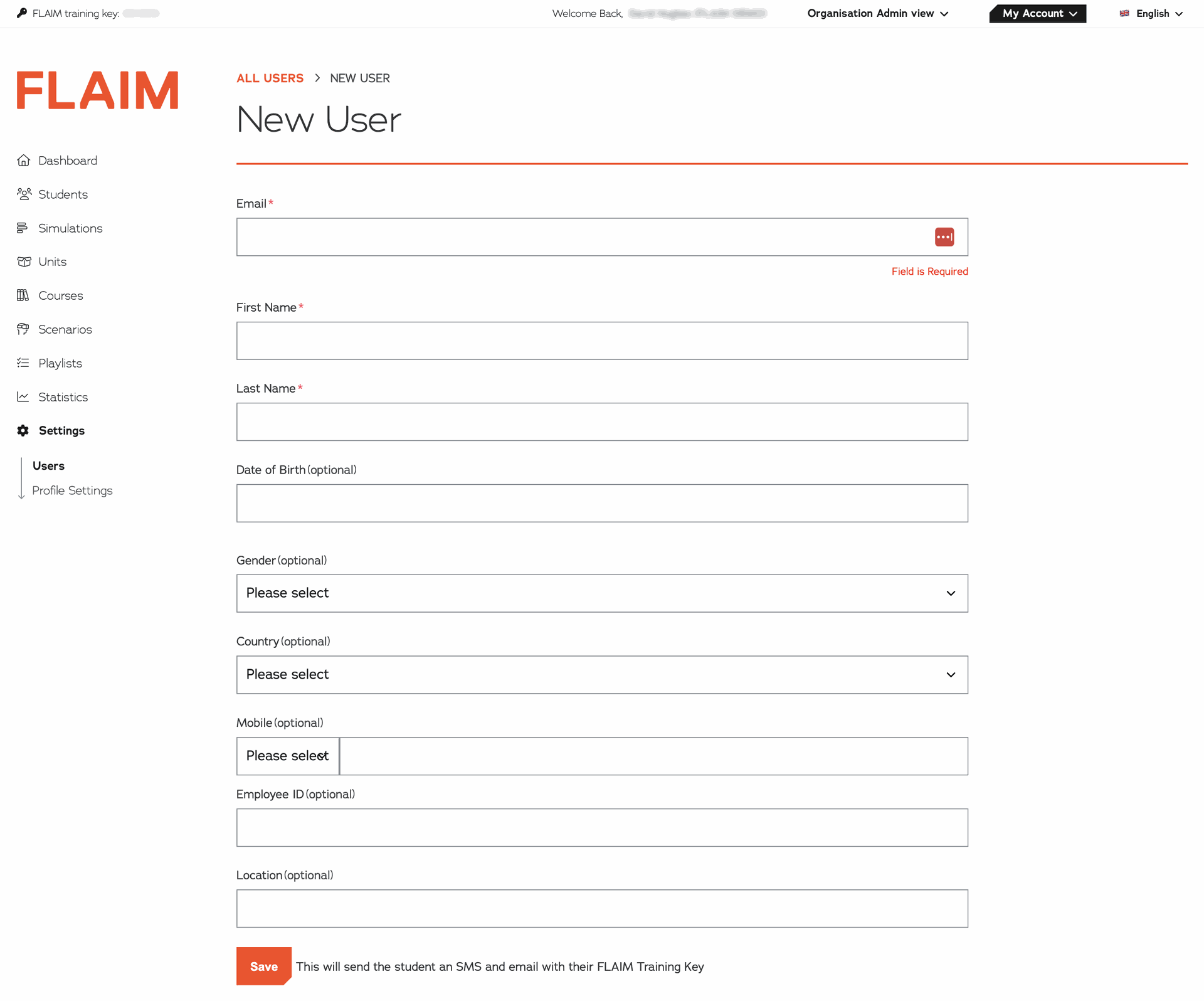 3. The New User Page will now be displayed. Type the email address of the Student User in the Email field. You must ensure you type the same email address recorded on the Student User account. When you have typed the email address into the Email field click elsewhere on the page.