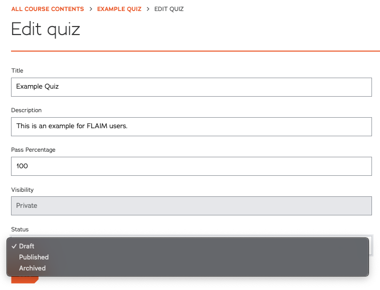 To make the quiz available for courses you need to change its status from “Draft” to “Published”.