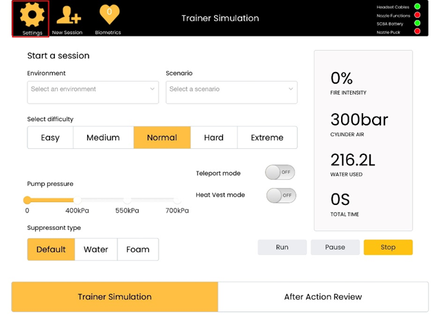 - Once the system is powered on with the Heat Vest is connected, launch the iPad app and navigate to the main facilitator screen as pictured below. Then, select the Settings cog ⚙️ icon in the top left corner of the screen.