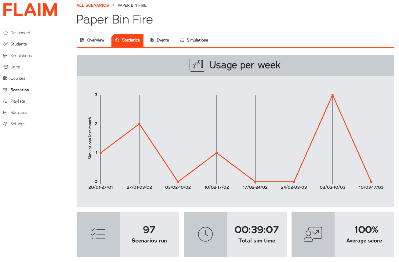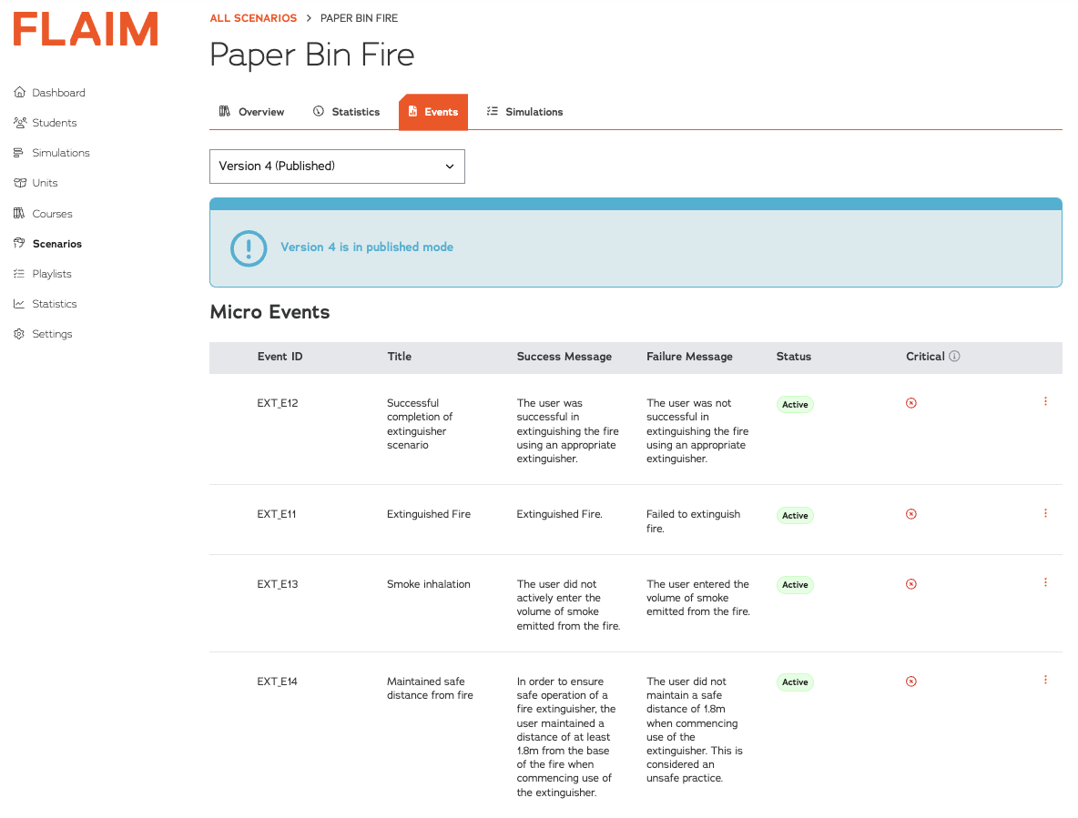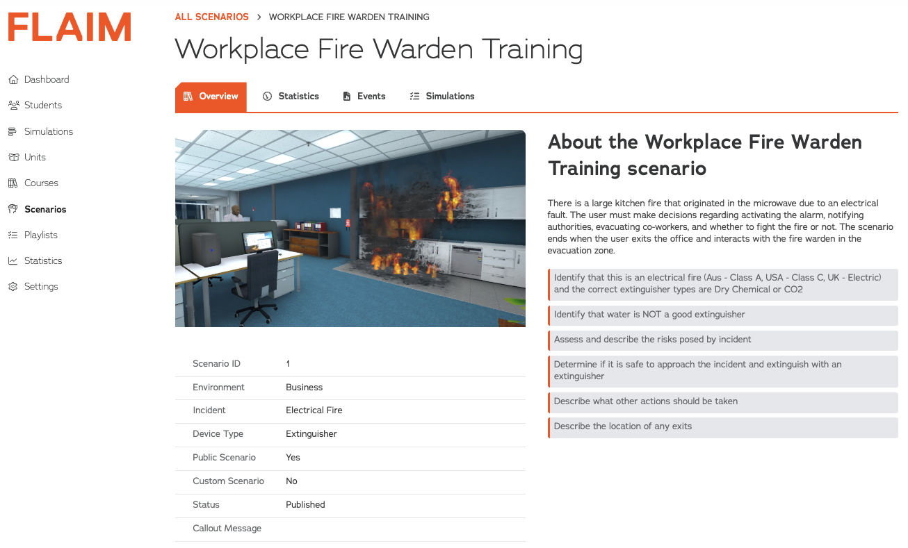- FLAIM Device type (most scenarios are exclusive to either FLAIM Trainer or FLAIM Workplace Safety: Fire)